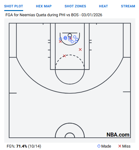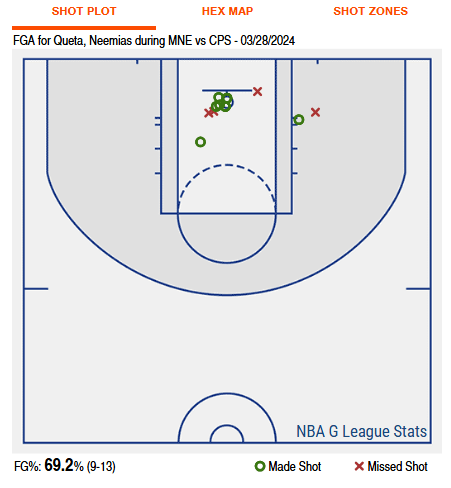 Again, this is the most shot attempts of that season for him, and you can already tell that one year and one coaching change later he’s simplified his role. All of his shots came from lobs, put back dunks, and baby hooks. There were a couple of exceptions but for the most part he was starting to play the role that we would see him play for the Boston Celtics and that is by design. Much has been said about Celtics legend Phil Pressy and his playing career but he’s really found a niche for himself coaching the Maine Celtics. Him and Joe Mazzulla run very, eerily even, similar schemes and that is very much on purpose. The Celtics organization has streamlined their player development by running the same offensive and defensive schemes. This allows the players to have the schemes ingrained in their mind so when they do eventually get the call-up to Boston they don’t miss a beat. For proof of how well that can translate take a look at the shot chart for Queta last night during his national coming out party: