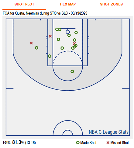 I don’t have individual plays to show you from these games because the G-League doesn’t keep archives of their games like the NBA does when you’re looking at the box scores (fix your league Adam), but I can show you the evolution of Queta and the simplification of his role in three pictures. Here is a look at a shot chart of a game during his last year in Stockton against the Utah Jazz G-League team where he took the most shot attempts of the year: