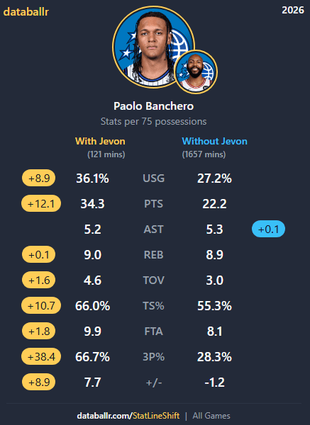 I’ve given Jevon the moniker of “The Paolo Whisperer” and the stats back it up. Since Carter signed with the team on February 6th, Paolo has averaged 23.3 points, 8.9 rebounds, 5.6 assists, and has shot relatively efficiently given his struggles this year. The Jevon/Paolo connection passes the eye test as Paolo seems much more confident when Carter is on the floor AND it passes the calculator test as his stats while Carter is on the floor are STAGGERING (albeit in limited minutes).